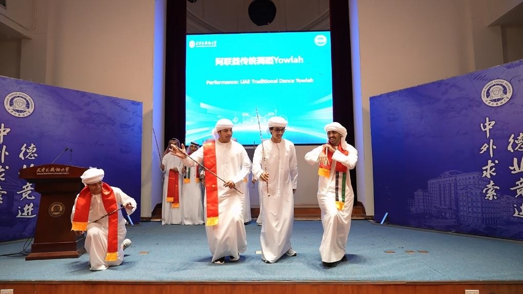 天津外國(guó)語(yǔ)大學(xué)的校園里,海棠盛開,綠意盎然。在此次交流學(xué)習(xí)項(xiàng)目的開班儀式上,中阿兩國(guó)學(xué)生代表以精彩演出互致青春?jiǎn)柡颍褐袊?guó)民族樂器齊奏《云之南》、中阿雙語(yǔ)演唱《我們都一樣》、節(jié)奏明快的阿聯(lián)酋傳統(tǒng)舞蹈點(diǎn)燃活動(dòng)現(xiàn)場(chǎng)……