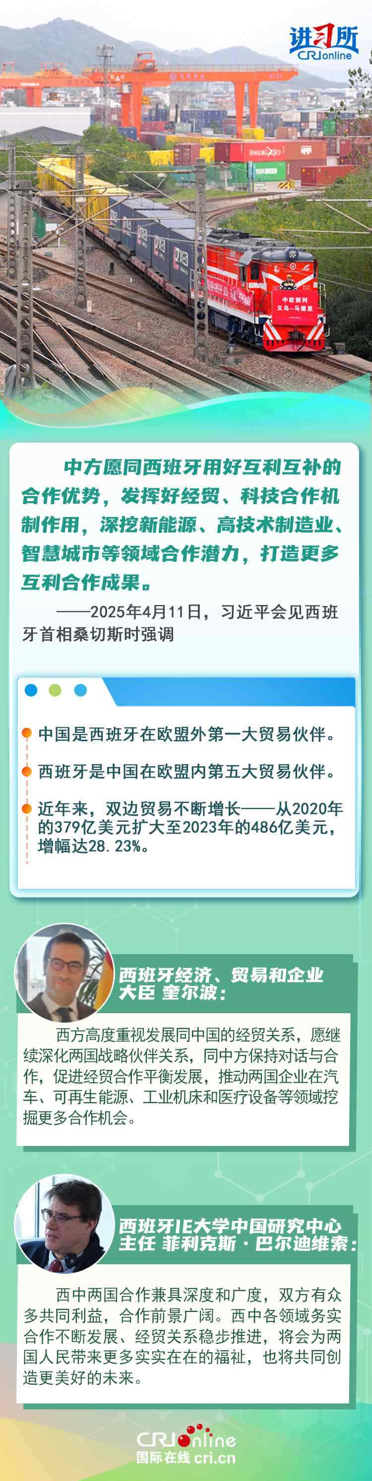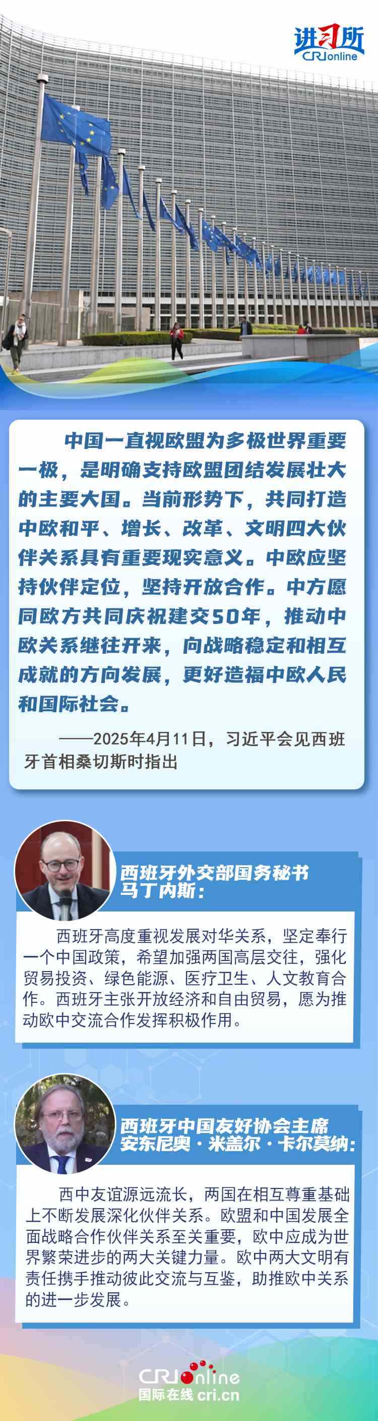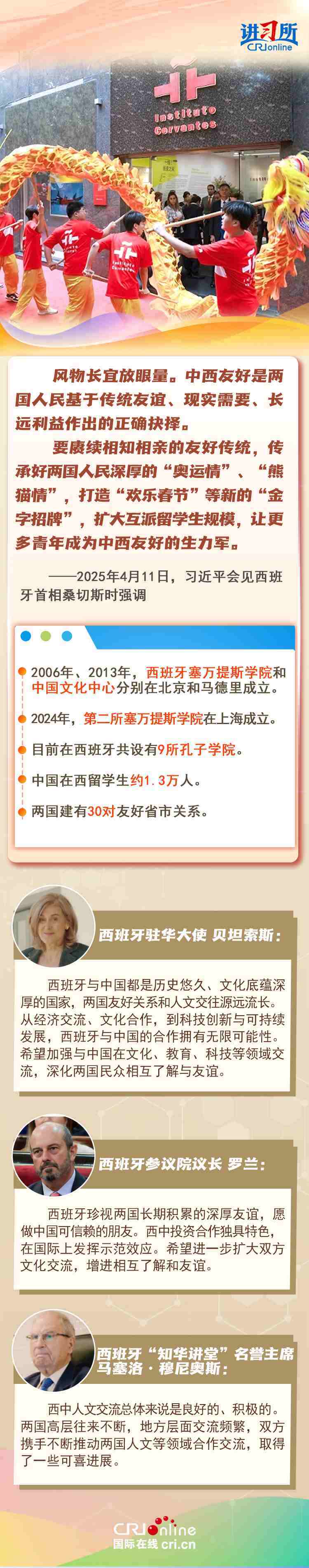 今年是中西全面戰(zhàn)略伙伴關(guān)系建立20周年,也是中歐建交50周年。多年來,中西兩國領(lǐng)導(dǎo)人保持密切互動,秉持互尊互信、互利共贏精神,兩國在深化貿(mào)易、投資、科技創(chuàng)新、綠色能源等領(lǐng)域取得豐富合作成果,雙邊關(guān)系走在中國同歐洲國家關(guān)系前列。在西班牙人士眼中,良好的對華關(guān)系對西班牙、歐洲和世界具有重要意義,將會為兩國人民帶來更多實實在在的福祉,也將共同創(chuàng)造更美好的未來。