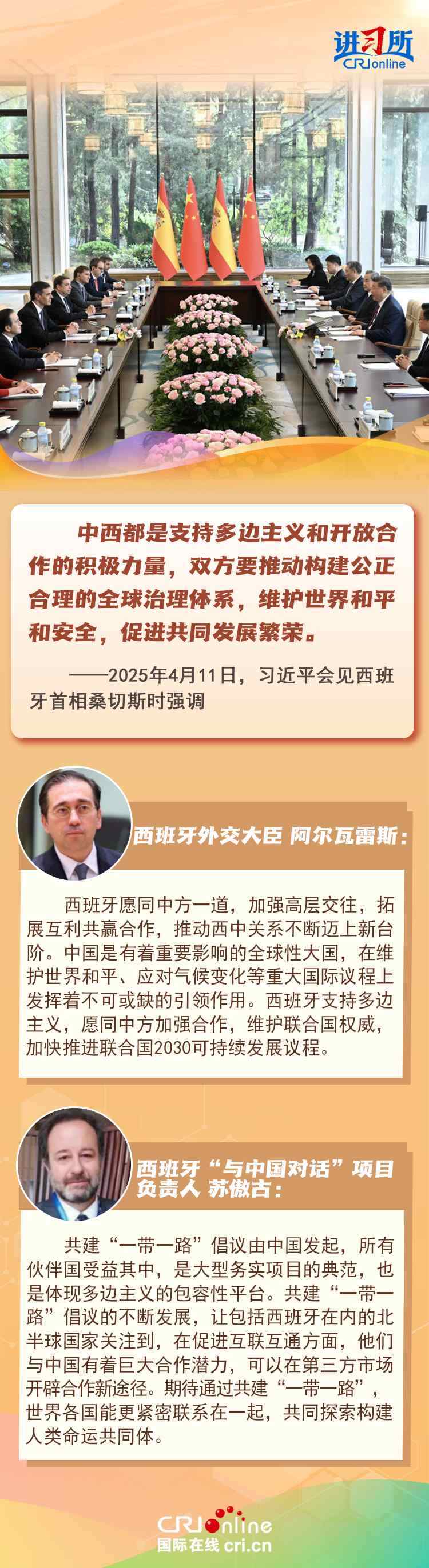 4月11日,中國國家主席習(xí)近平在北京會見來華訪問的西班牙首相桑切斯時表示,中西友好是兩國人民基于傳統(tǒng)友誼、現(xiàn)實需要、長遠(yuǎn)利益作出的正確抉擇,中西都是支持多邊主義和開放合作的積極力量,雙方要推動構(gòu)建公正合理的全球治理體系,維護(hù)世界和平和安全,促進(jìn)共同發(fā)展繁榮。