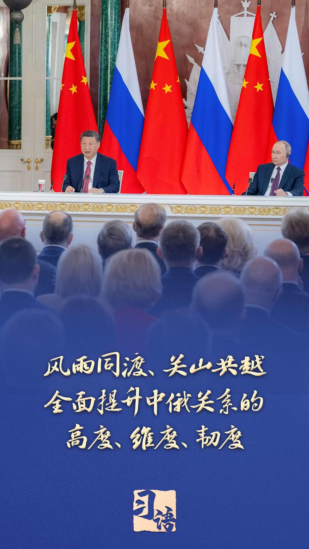 “面對變亂交織的國際形勢,中俄兩國要堅(jiān)定秉持永久睦鄰友好、全面戰(zhàn)略協(xié)作、互利合作共贏精神,風(fēng)雨同渡、關(guān)山共越,全面提升中俄關(guān)系的高度、維度、韌度,為世界和平和安全注入更多穩(wěn)定性,為全球發(fā)展繁榮提供更強(qiáng)推動(dòng)力?!碑?dāng)?shù)貢r(shí)間5月8日,習(xí)近平在同俄羅斯總統(tǒng)普京共同會(huì)見記者時(shí)指出。
