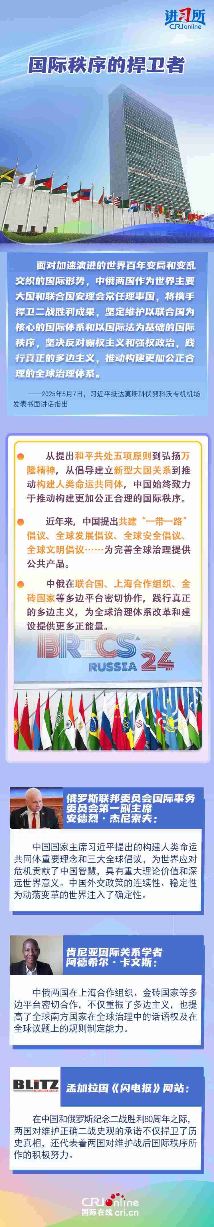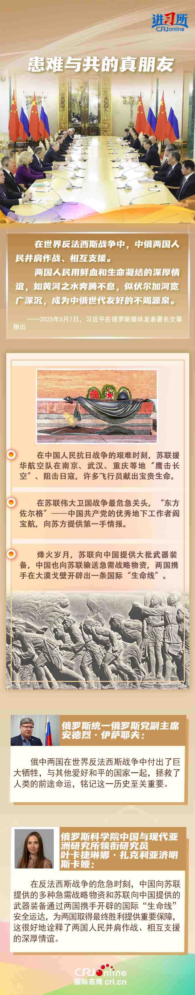 “兩國人民用鮮血和生命凝結(jié)的深厚情誼,如黃河之水奔騰不息,似伏爾加河寬廣深沉,成為中俄世代友好的不竭源泉?!苯衲晔侵袊嗣窨谷諔?zhàn)爭、蘇聯(lián)偉大衛(wèi)國戰(zhàn)爭暨世界反法西斯戰(zhàn)爭勝利80周年,也是聯(lián)合國成立80周年。在這一重要?dú)v史時間節(jié)點(diǎn),習(xí)近平主席此訪不僅為中俄關(guān)系發(fā)展注入強(qiáng)勁動力,也向世界宣示中俄兩國攜手捍衛(wèi)二戰(zhàn)勝利成果的堅(jiān)定意志。
