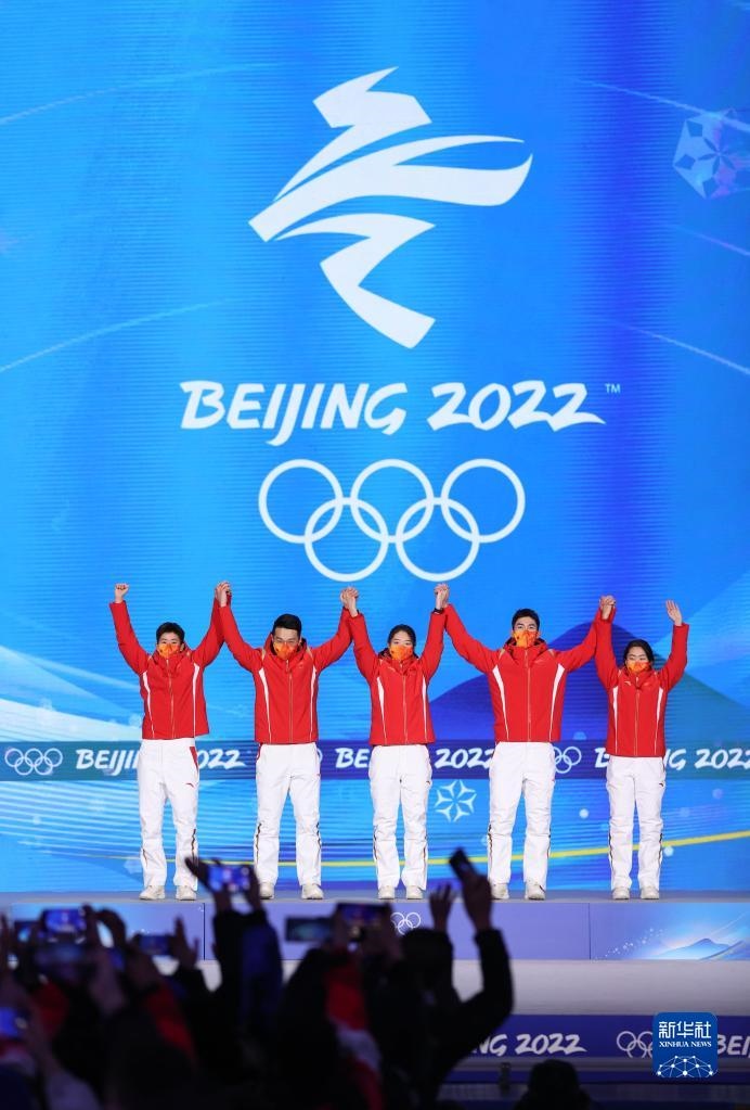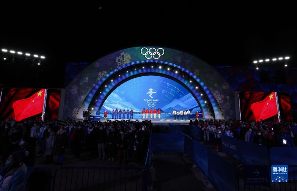 當日,北京2022年冬奧會短道速滑混合團體接力獎牌頒發(fā)儀式在北京賽區(qū)頒獎廣場舉行。