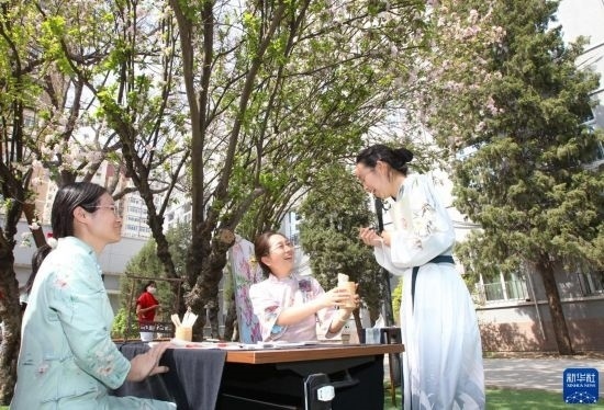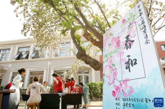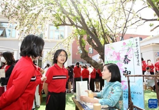 當(dāng)日,北師大實(shí)驗華夏女子中學(xué)舉辦以“春和”為主題的第二屆“海棠詩會”。師生們選取有關(guān)“春天”“和煦”“生機(jī)”“美好”的詩歌,在校園的海棠樹下賞析吟誦,共享詩歌之美,傳承中華優(yōu)秀傳統(tǒng)文化。