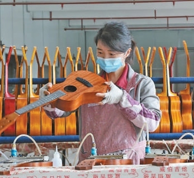 正安吉他文化產業(yè)園內,企業(yè)工人在制作樂器。趙永章攝