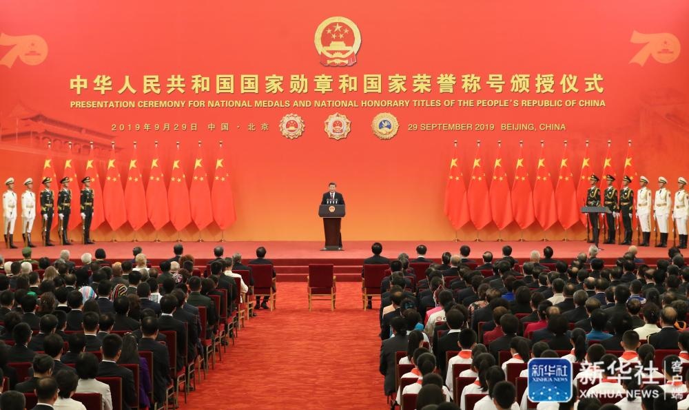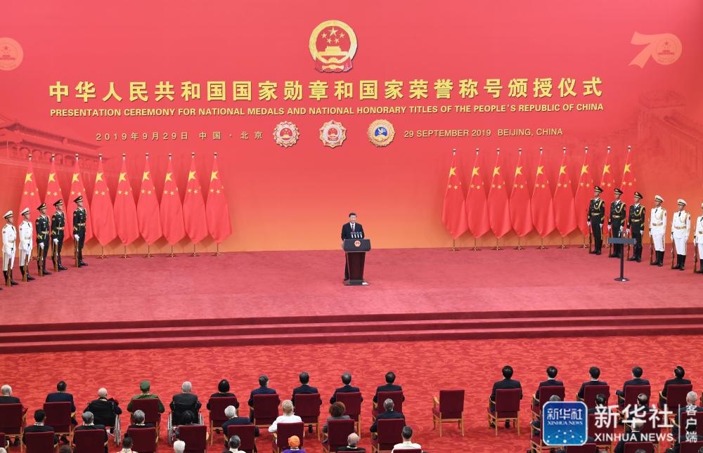 ↑9月29日,中華人民共和國國家勛章和國家榮譽(yù)稱號頒授儀式在北京人民大會堂金色大廳隆重舉行。中共中央總書記、國家主席、中央軍委主席習(xí)近平向國家勛章和國家榮譽(yù)稱號獲得者頒授勛章獎?wù)虏l(fā)表重要講話。新華社記者黃敬文攝
