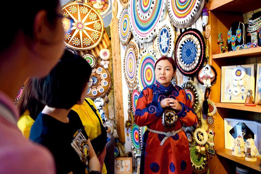 借助自己的鄂倫春族身份,白鵬英成立手工藝坊,組織婦女制作鄂倫春族手工藝品,然后利用網(wǎng)上平臺銷售到全國各地,每個(gè)婦女每年平均可增收1000元。