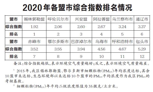 2020年1—12月,全區(qū)環(huán)境空氣質(zhì)量優(yōu)良天數(shù)比例平均為90.8%。12個(gè)盟市優(yōu)良天數(shù)比例由高至低依次為:呼倫貝爾市(100.0%)、錫林郭勒盟(98.9%)、興安盟(97.0%)、赤峰市(95.1%)、阿拉善盟(94.8%)、烏蘭察布市(94.8%)、通遼市(91.0%)、鄂爾多斯市(90.7%)、巴彥淖爾市(84.1%)、烏海市(83.1%)、呼和浩特市(80.3%)和包頭市(79.5%)。