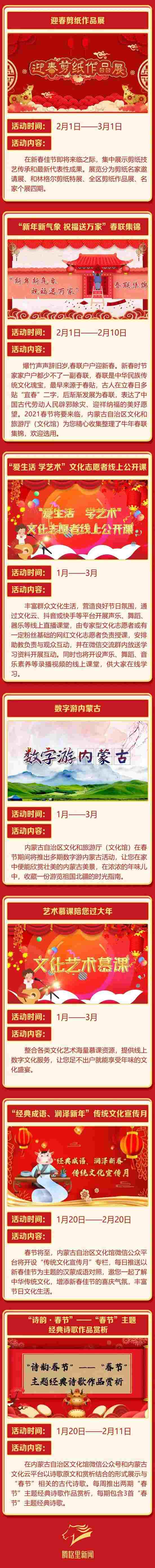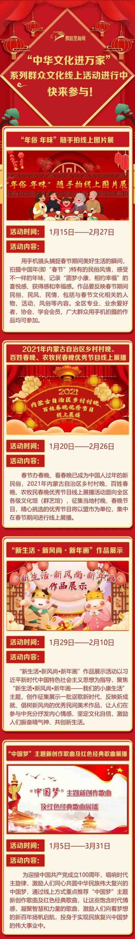 2021年春節(jié)的腳步越來越近,為豐富春節(jié)期間廣大群眾的精神文化生活,營(yíng)造歡樂、團(tuán)圓、喜慶、祥和的節(jié)日氛圍,內(nèi)蒙古自治區(qū)文化和旅游廳(文化館)于2021年1月至3月將推出“中華文化進(jìn)萬家”系列群眾文化線上活動(dòng)。
