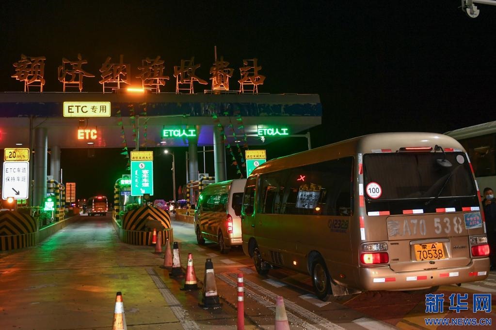 10月29日,滯留在額濟納旗的旅游包車有序通過額濟納旗收費站。新華社記者 貝赫 攝
