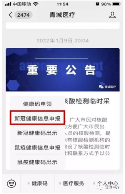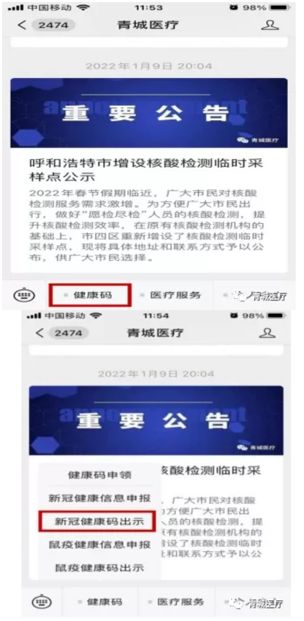 打開青城醫(yī)療微信公眾號,點(diǎn)擊“健康碼”選擇“新冠健康碼出示”。
