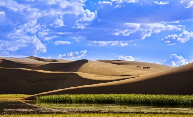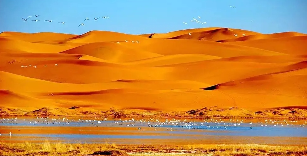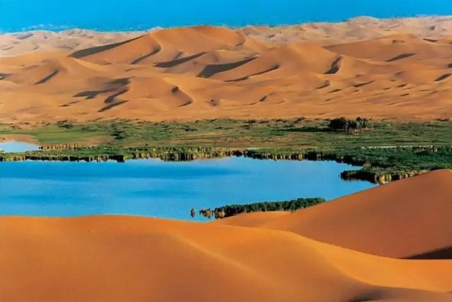 巴丹吉林沙漠年降水量不足40毫米,但是沙漠中的湖泊竟然多達(dá)100多個(gè)。高聳入云的沙山,神秘莫測的鳴沙,靜謐的湖泊、濕地,構(gòu)成了巴丹吉林沙漠獨(dú)特的迷人景觀,于2005年被《中國國家地理》雜志評(píng)為中國最美麗的沙漠,每年吸引了上萬名國內(nèi)外游客前來觀光。