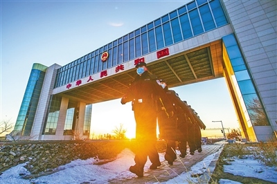 內(nèi)蒙古出入境邊防檢查總站二連出入境邊防檢查站民警在二連浩特國門執(zhí)勤巡邏,守護國門安全。郭鵬杰攝