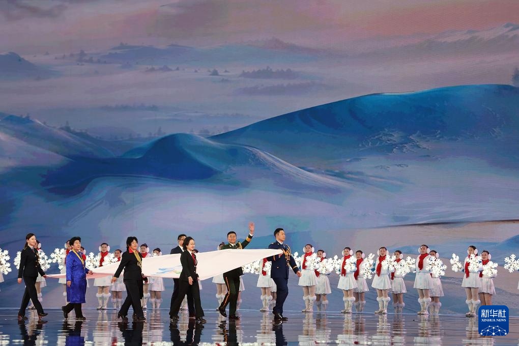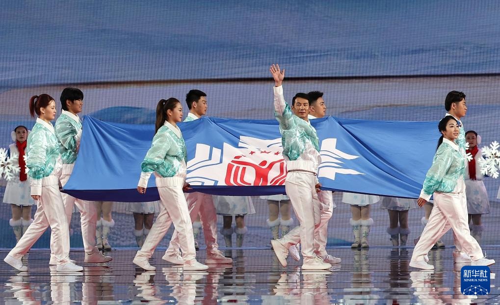 ??2月17日,中華人民共和國冬季運(yùn)動(dòng)會會旗在開幕式上入場。新華社記者 黃偉 攝