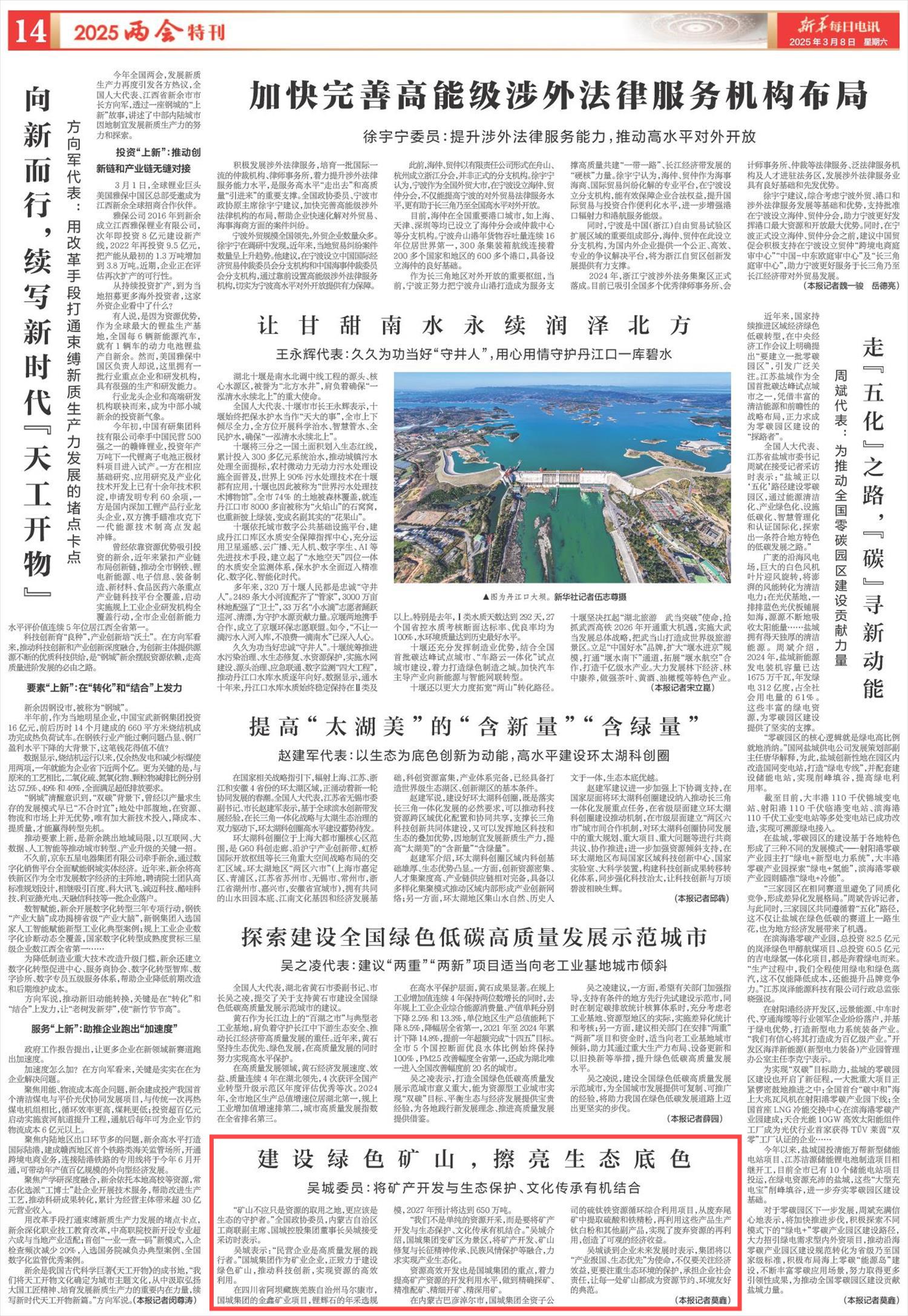 2025年3月8日,《新華每日電訊》第14版刊發(fā)題為《建設綠色礦山,擦亮生態(tài)底色》的消息,報道了吳城委員介紹,“我們不是單純的資源開采,而是要將礦產(chǎn)開發(fā)與生態(tài)保護、文化傳承有機結合?!?/p>