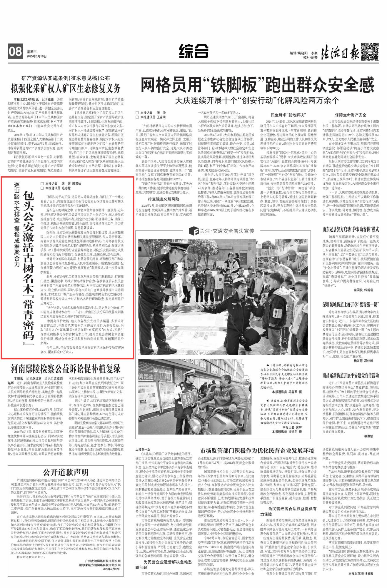 2025年3月19日,《法治日?qǐng)?bào)》第8版刊發(fā)題為《巡山踏水大排查 攥指成拳聚合力 包頭公安激活古樹(shù)名木“常青密碼”》的文章,報(bào)道了近年來(lái),包頭市各級(jí)公安機(jī)關(guān)緊緊圍繞古樹(shù)名木保護(hù)工作,深入開(kāi)展巡控排查行動(dòng),成立領(lǐng)導(dǎo)小組、制定行動(dòng)方案、明確目標(biāo)任務(wù)、確保工作推進(jìn),積極開(kāi)展巡控排查、綜合治理、宣傳發(fā)動(dòng)各項(xiàng)工作,全力營(yíng)造保護(hù)古樹(shù)名木良好氛圍,取得顯著成效。