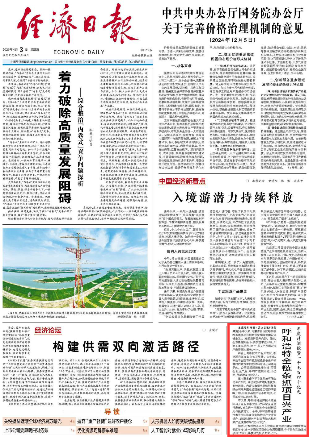 2025年4月3日,《經(jīng)濟(jì)日報(bào)》第1版刊發(fā)題為《年度計(jì)劃投資一千七百四十億元 呼和浩特全鏈條抓項(xiàng)目興產(chǎn)業(yè)》的文章,報(bào)道了今年以來,內(nèi)蒙古自治區(qū)呼和浩特市圍繞項(xiàng)目招商引資和落地建設(shè)全鏈條發(fā)力,推動(dòng)經(jīng)濟(jì)回升向好。