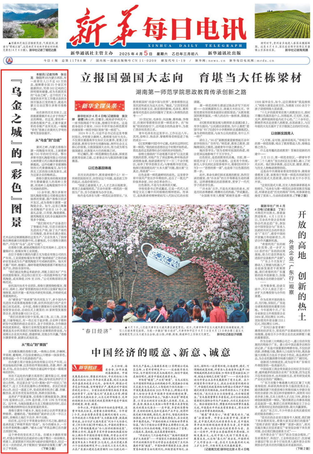 2025年4月5日,《新華每日電訊》第1版刊發(fā)題為《“烏金之城”的“彩色”圖景》的文章,報(bào)道了內(nèi)蒙古自治區(qū)鄂爾多斯市準(zhǔn)格爾旗,這座能源重鎮(zhèn)并未止步于傳統(tǒng)產(chǎn)業(yè)的輝煌。在這里,曾經(jīng)單一的黑色煤炭產(chǎn)業(yè),正被豐富多彩的非煤產(chǎn)業(yè)所充實(shí),一幅幅“彩色”圖景正在黃河幾字彎的臂彎里徐徐展開(kāi)。