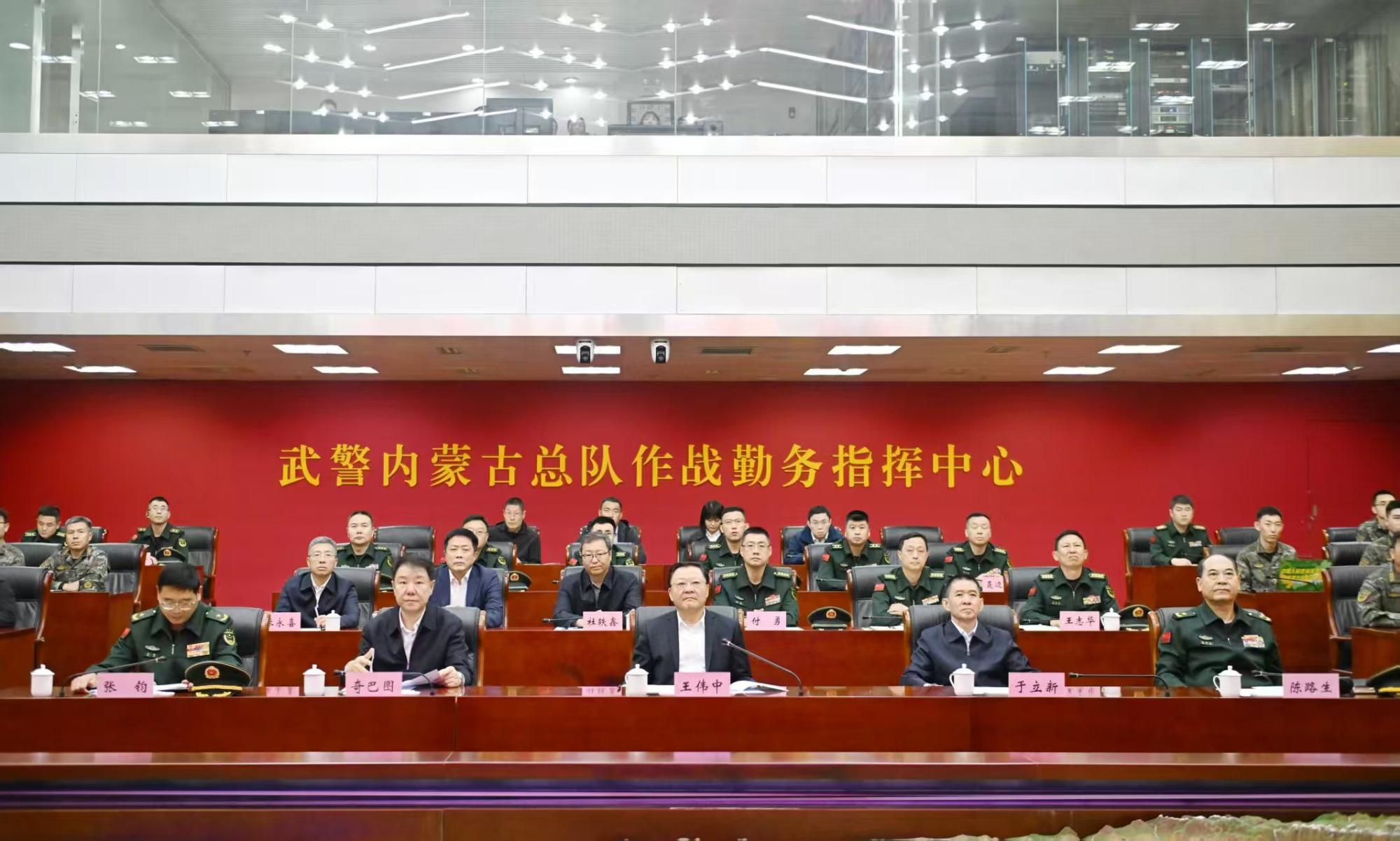 在武警內(nèi)蒙古總隊,王偉中來到作戰(zhàn)勤務(wù)指揮中心,仔細(xì)聽取部隊建設(shè)和指揮中心運(yùn)行情況介紹。他指出,武警內(nèi)蒙古總隊是一支有著光榮歷史的英雄部隊,希望部隊繼續(xù)關(guān)心支持自治區(qū)經(jīng)濟(jì)社會發(fā)展,加強(qiáng)練兵備戰(zhàn),做好應(yīng)急準(zhǔn)備,當(dāng)好內(nèi)蒙古高質(zhì)量發(fā)展和長治久安的堅強(qiáng)基石、忠誠衛(wèi)士,為全區(qū)社會大局穩(wěn)定和人民群眾安居樂業(yè)保駕護(hù)航。