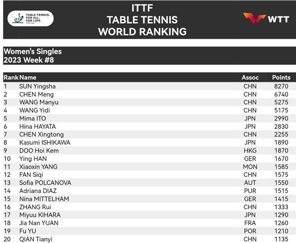 女單排名 圖片來源:國(guó)際乒聯(lián)官網(wǎng)