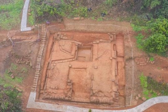 這是2月9日在重慶合川釣魚城遺址拍攝的新發(fā)掘出的類似闕臺建筑的基址(無人機(jī)照片)。新華社記者 黃偉 攝