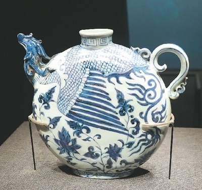 一件精美的青花鳳首扁壺引人注目。此壺出土于北京舊鼓樓大街豁口以東一處元代院落遺址。壺身為扁圓形,以鳳首為流,鳳尾作柄,用青料在壺身上繪出展翅飛翔的鳳鳥,器形與紋飾渾然一體,構(gòu)思精絕?!斑@是首都博物館收藏的國家一級文物。”章文永說,“青花瓷體現(xiàn)了元代承接唐宋并對不同文化兼容并蓄的時代氣象,元大都正是在這種氛圍中誕生的偉大杰作?!?/P>