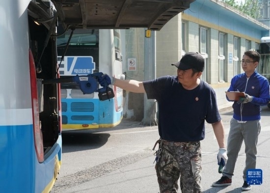 5月1日,在位于北京市朝陽區(qū)的柳芳公交場站,技術(shù)員王陸斌對車輪測溫。