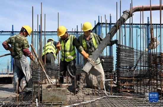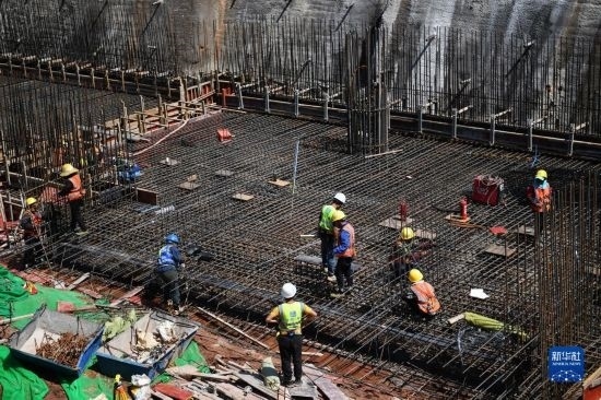 5月1日,在浙江省杭州市臨平區(qū)一個項目工地,中建三局的建設(shè)者在施工中。