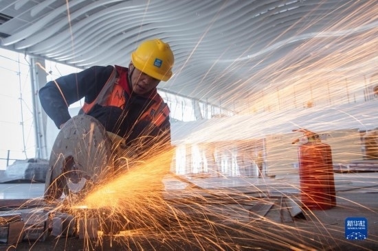 5月1日,在中建三局承建的武漢天河機場T2航站樓改造工程項目工地,工人在切割材料。