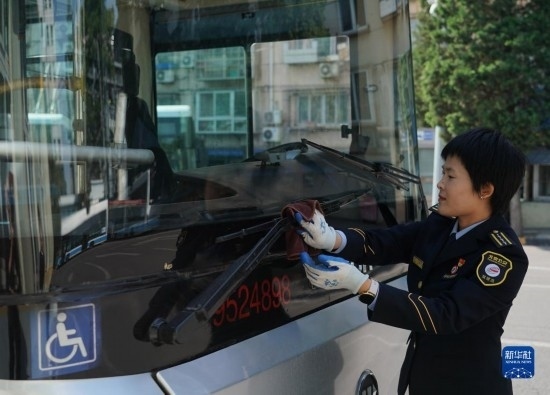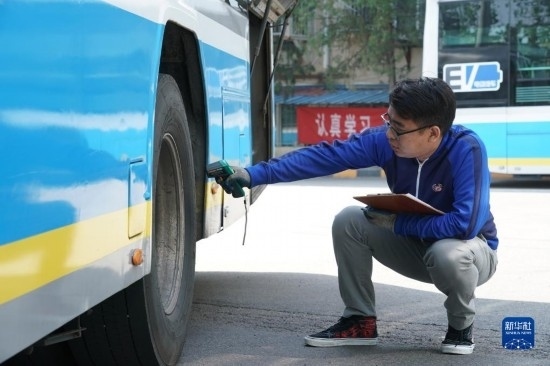 5月1日,在位于北京市朝陽區(qū)的柳芳公交場站,104路公交車駕駛員高國然在發(fā)車前進行出車例檢。