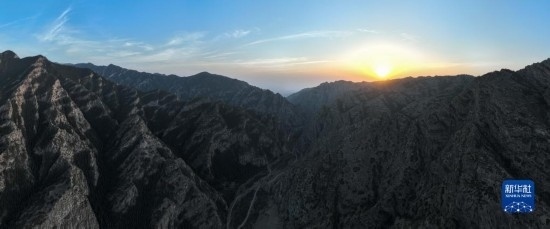 日落時(shí)分的內(nèi)蒙古賀蘭山國(guó)家級(jí)自然保護(hù)區(qū)(5月11日攝,無(wú)人機(jī)全景照片)。