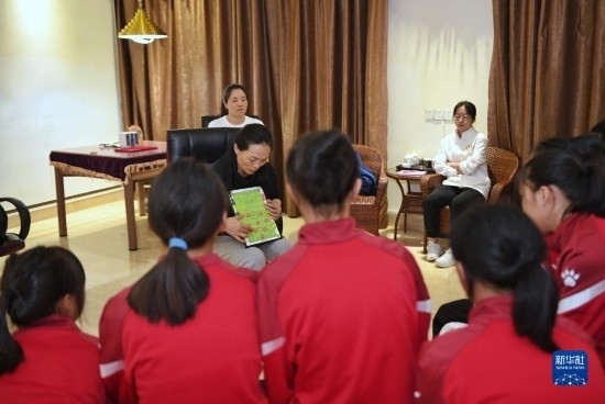 在海南瓊中縣舉辦的中國足協(xié)女足青訓(xùn)中心“希望杯”U12組比賽的空閑時(shí)段,來自涼山彝族自治州的四川隊(duì)隊(duì)員舍布么扯鳩莫(左二)和隊(duì)友們?cè)诶蠋煄ьI(lǐng)下學(xué)習(xí)文化課(4月10日攝)。