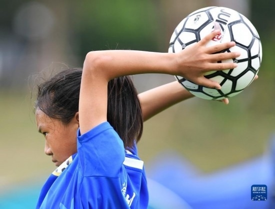 在海南瓊中縣舉辦的中國足協(xié)女足青訓(xùn)中心“希望杯”U12組四川隊(duì)對(duì)陣廣東隊(duì)的比賽中,來自涼山彝族自治州的四川隊(duì)球員舍布么扯鳩莫發(fā)邊線球(4月10日攝)。