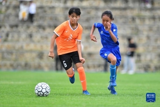 在海南瓊中縣舉辦的中國足協(xié)女足青訓(xùn)中心“希望杯”U12組四川隊(duì)對(duì)陣廣東隊(duì)的比賽中,來自涼山彝族自治州的四川隊(duì)球員舍布么扯鳩莫(右)奮力拼搶(4月10日攝)。