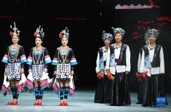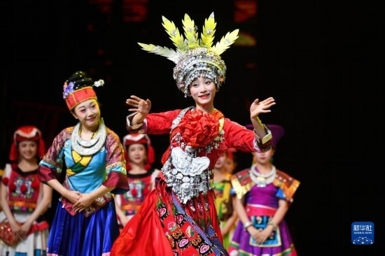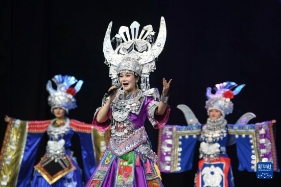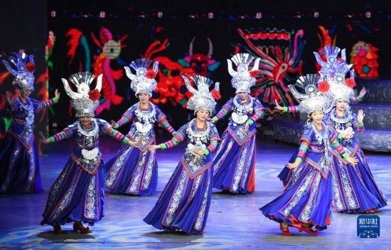 6月5日,演員在貴陽(yáng)大劇院的《多彩貴州風(fēng)》演出中表演節(jié)目《金繡銀飾》。