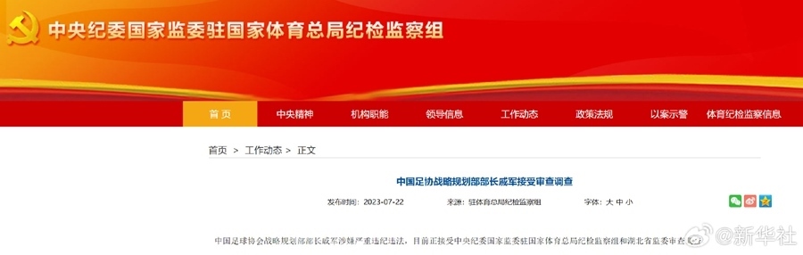中國足球協(xié)會技術(shù)部部長譚海涉嫌嚴重違紀違法,目前正接受中央紀委國家監(jiān)委駐國家體育總局紀檢監(jiān)察組和湖北省監(jiān)委審查調(diào)查。中國足球協(xié)會戰(zhàn)略規(guī)劃部部長戚軍涉嫌嚴重違紀違法,目前正接受中央紀委國家監(jiān)委駐國家體育總局紀檢監(jiān)察組和湖北省監(jiān)委審查調(diào)查。(中央紀委國家監(jiān)委駐國家體育總局紀檢監(jiān)察組)