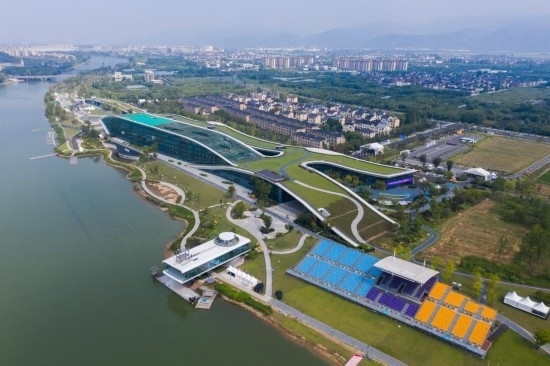 8月24日,空中俯瞰杭州富陽(yáng)水上運(yùn)動(dòng)中心,屋頂被綠植覆蓋。新華社記者 徐昱 攝