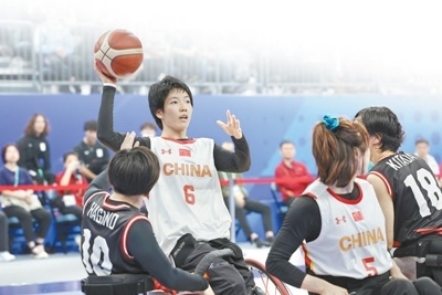 杭州亞殘運會輪椅籃球女子金牌賽,中國體育代表團運動員張雪梅(左二)在比賽中。環(huán)球時報記者 崔 萌攝
