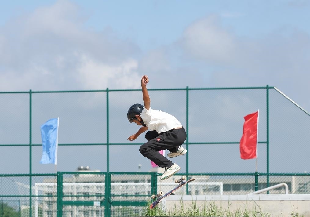 11月4日,武漢市選手詹何在第一屆全國學(xué)生(青年)運(yùn)動會滑板男子街式?jīng)Q賽中奪冠。新華社記者 胡星宇 攝