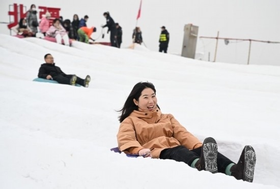 冬季的內(nèi)蒙古賽馬場變成了冰雪樂園,場地中間建起一座十幾米高的人造雪山,等著玩滑雪圈的人群從山頂一直排到山腳下,周圍還有冰上腳踏車、冰上陀螺等冰雪體驗設備。曹博雅坐著雪圈從山頂飛速滑下,又拉著爸爸坐上了旋轉小雪車。