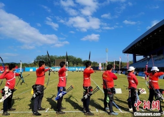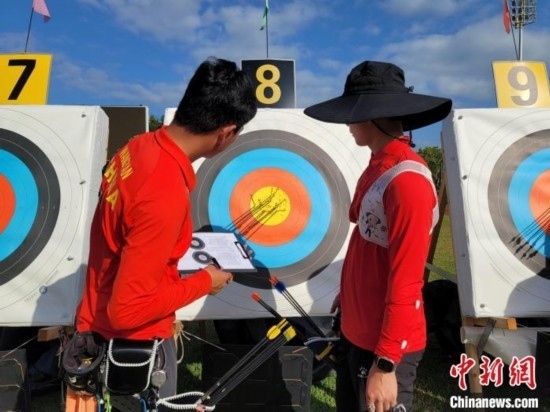 國家體育訓(xùn)練南方基地(海南白沙·綜合),一輪射箭之后,運動員在查看中靶情況。中新網(wǎng)記者王曉斌攝