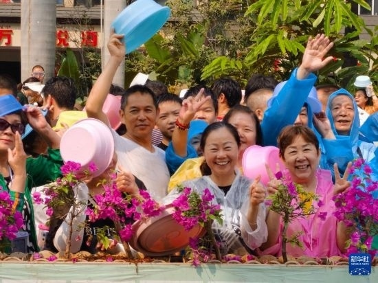 當日,云南省西雙版納傣族自治州舉行潑水狂歡活動,人們歡聚在景洪市潑水廣場,用相互潑水的方式互送祝福,慶祝潑水節(jié)。
