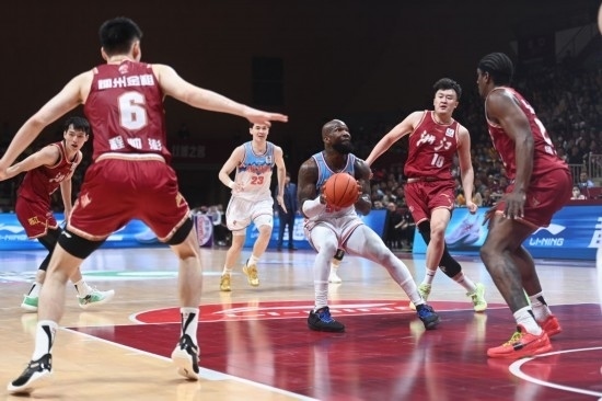 5月9日,新疆隊(duì)球員瓊斯(右三)在比賽中進(jìn)攻。新華社記者 黃宗治 攝