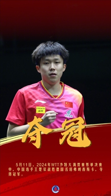 今天,在2024年WTT沙特大滿貫賽男單決賽中,中國選手王楚欽戰(zhàn)勝德國名將弗朗西斯卡奪冠。王楚欽此前分別搭檔隊(duì)友孫穎莎、馬龍奪得混雙、男雙冠軍。(記者:王海洲)
