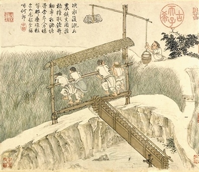 通過品讀繪畫中的水利機具發(fā)展變化,不僅可以直觀感受勞動技術的進步,還有助于從古人識水、用水的智慧中汲取養(yǎng)分。