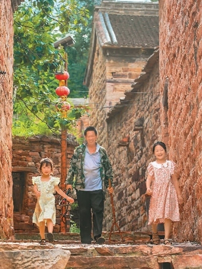 在柴關(guān)鄉(xiāng)石門溝村,街巷地面全由紅石板鋪成,石板街道隨地勢(shì)起伏,陡坡處壘砌有石板臺(tái)階。圖為村民走過(guò)石門溝村的古巷。邵玉姿、高儒森攝
