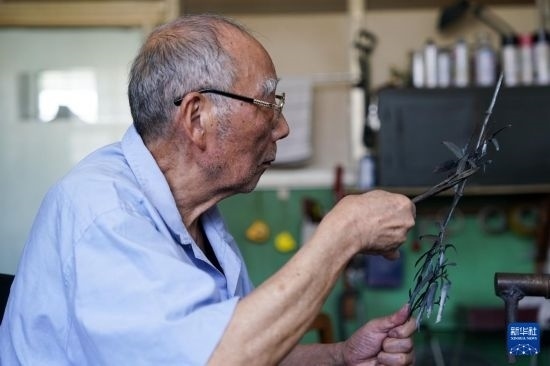 今年80歲的湯傳松,是蕪湖工藝美術(shù)廠的技術(shù)總監(jiān),也是蕪湖鐵畫鍛制技藝省級非物質(zhì)文化遺產(chǎn)傳承人。據(jù)湯傳松介紹,鐵畫鍛制工藝起源于鐵匠,需將鐵燒紅,而后使用錘頭趁熱打鐵,將鐵塑造成畫稿中的基本形狀,而后使用銼、鉆等工具進一步塑造,乃至用剪刀、鑷子進行修形,再將各個部位焊接組合,最后裝裱成畫,流程繁多,制作周期較長。