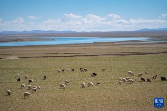 6月22日,羊群在色林錯(cuò)湖畔草場(chǎng)上吃草。