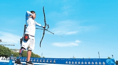 當(dāng)?shù)貢r間8月24日,在法國巴黎榮軍院旁的射箭訓(xùn)練場內(nèi),中國殘奧射箭隊在進(jìn)行適應(yīng)性訓(xùn)練。拉弓、瞄準(zhǔn)、松弦,中國隊選手甘俊射出正中靶心的一箭后,臉上露出笑容。他表示:“風(fēng)速、風(fēng)向?qū)穆潼c影響較大,我會盡快適應(yīng),調(diào)整到最佳狀態(tài)?!备士ψ约簠⒓拥氖讓脷垔W會充滿期待。