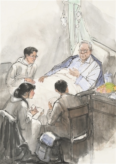 人民教師勤學(xué)篤行、求是創(chuàng)新的躬耕態(tài)度,給無數(shù)人以榜樣的力量,也給美術(shù)創(chuàng)作以靈感?!叭嗣窠逃摇眹覙s譽稱號獲得者衛(wèi)興華,終其一生都奮斗在勤學(xué)求真的道路上。90余歲時,即使病痛纏身,他仍堅持每天學(xué)習(xí)、工作。有感于衛(wèi)興華教授的敬業(yè)精神,高毅特意描繪了臥病在床的衛(wèi)興華堅持與學(xué)生探討學(xué)術(shù)課題的場景,主人公那專注的神情令人動容。像衛(wèi)興華這樣堅守耕耘的教師還有許多。劉昌明水彩畫《一個教師的工作臺》便以細致的場景描繪表達出對教師群體的敬意。貼著泛黃舊紙的墻面、藥瓶和墨水瓶之間的教案、脫漆的木桌、一副老花眼鏡……畫家在此調(diào)動了一切能夠反映老一輩教育者辛勤伏案的元素,象征著沒有直接出場的教師形象?!按颂師o聲勝有聲”的表達效果,令人回味無窮。