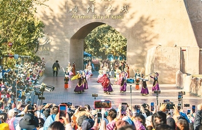 新疆維吾爾自治區(qū)喀什古城景區(qū)舉行形式多樣的文化演出活動(dòng),打造演藝品牌,促進(jìn)文旅融合發(fā)展。圖為游客觀賞古城開(kāi)城儀式演出。